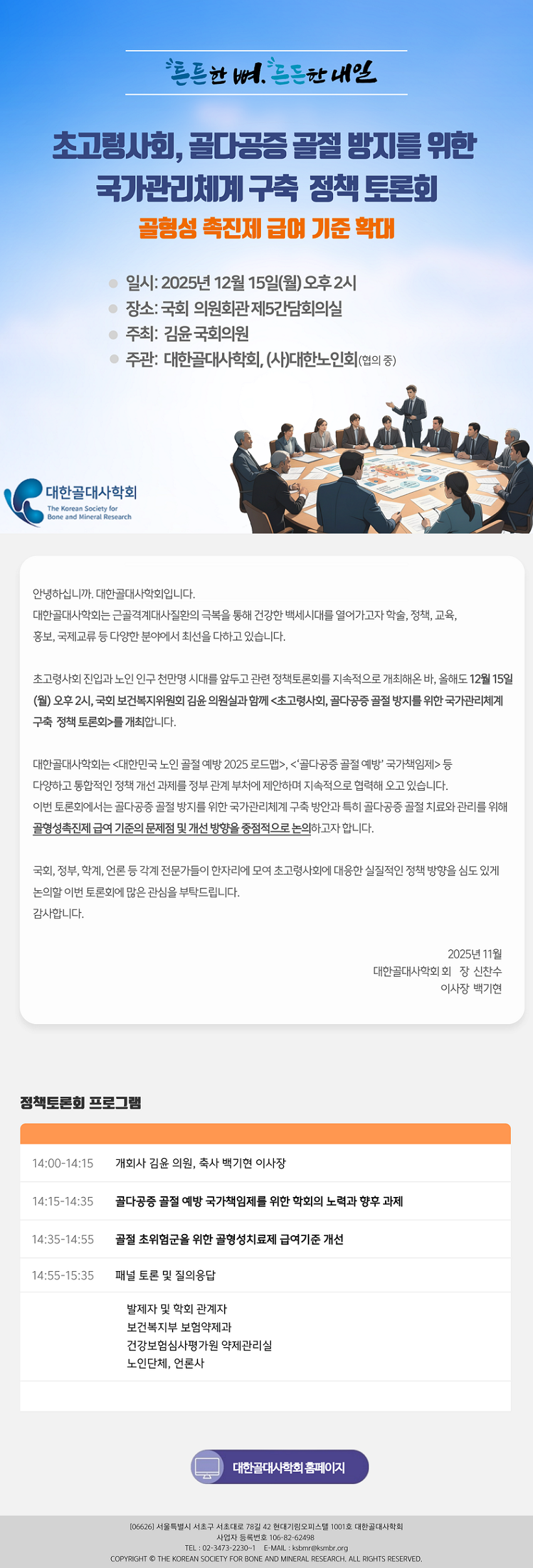 [정책토론회] 초고령사회, 골다공증 골절 방지를 위한 국가관리체계 구축 정책 토론회 (12/15(월), 국회회관)