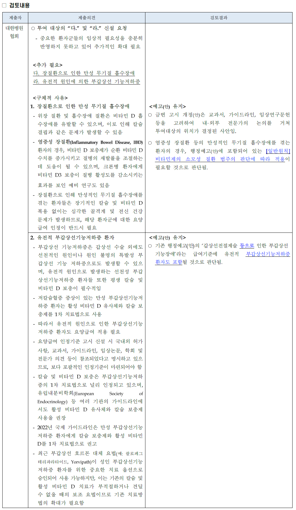 칼슘·비타민 D 복합경구제 급여 기준 관련 보건복지부 회신 안내